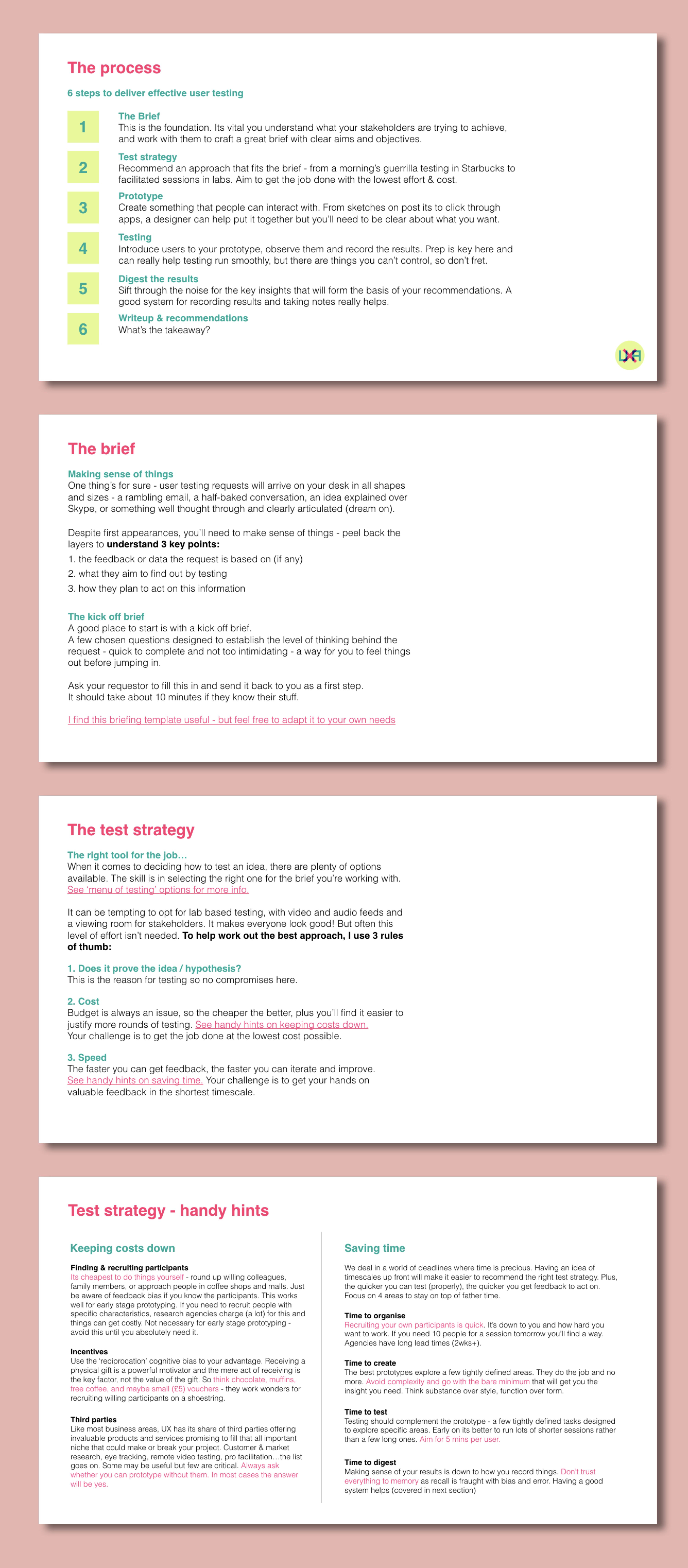 Part two looks at how to create those experiences (the UX design process).The first two steps focus on writing a brief and then working out a test strategy that fits the brief.
